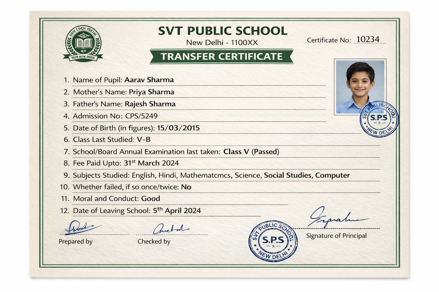 | 5 | Transfer certificate ( TC) | Transfer Certificate is an official document issued by a school confirming student’s withdrawal, last class attended, conduct, and date of leaving | View |