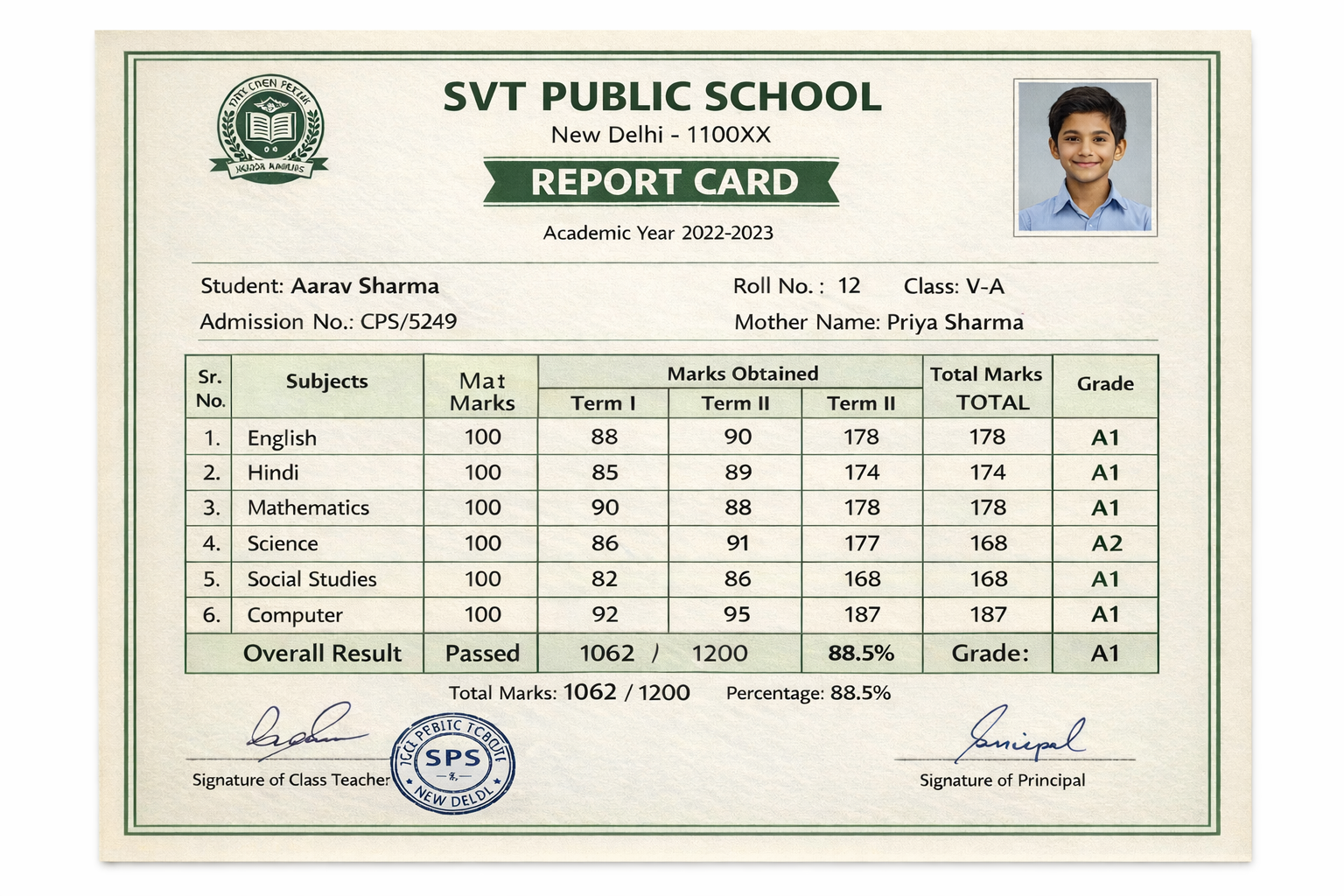 | 4 | Previous class marksheet / Report card | Previous class marksheet or report card shows student’s academic performance, subject-wise marks, grades, attendance, and overall result from the last completed class. | View |
